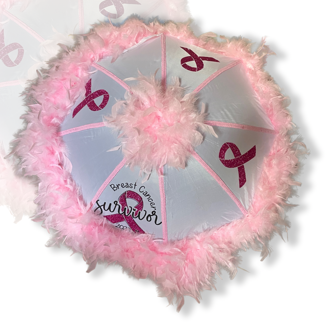 Made with variations of 100G Turkey feathers, glitter htv, beads, polyester trimming, nylon umbrella.